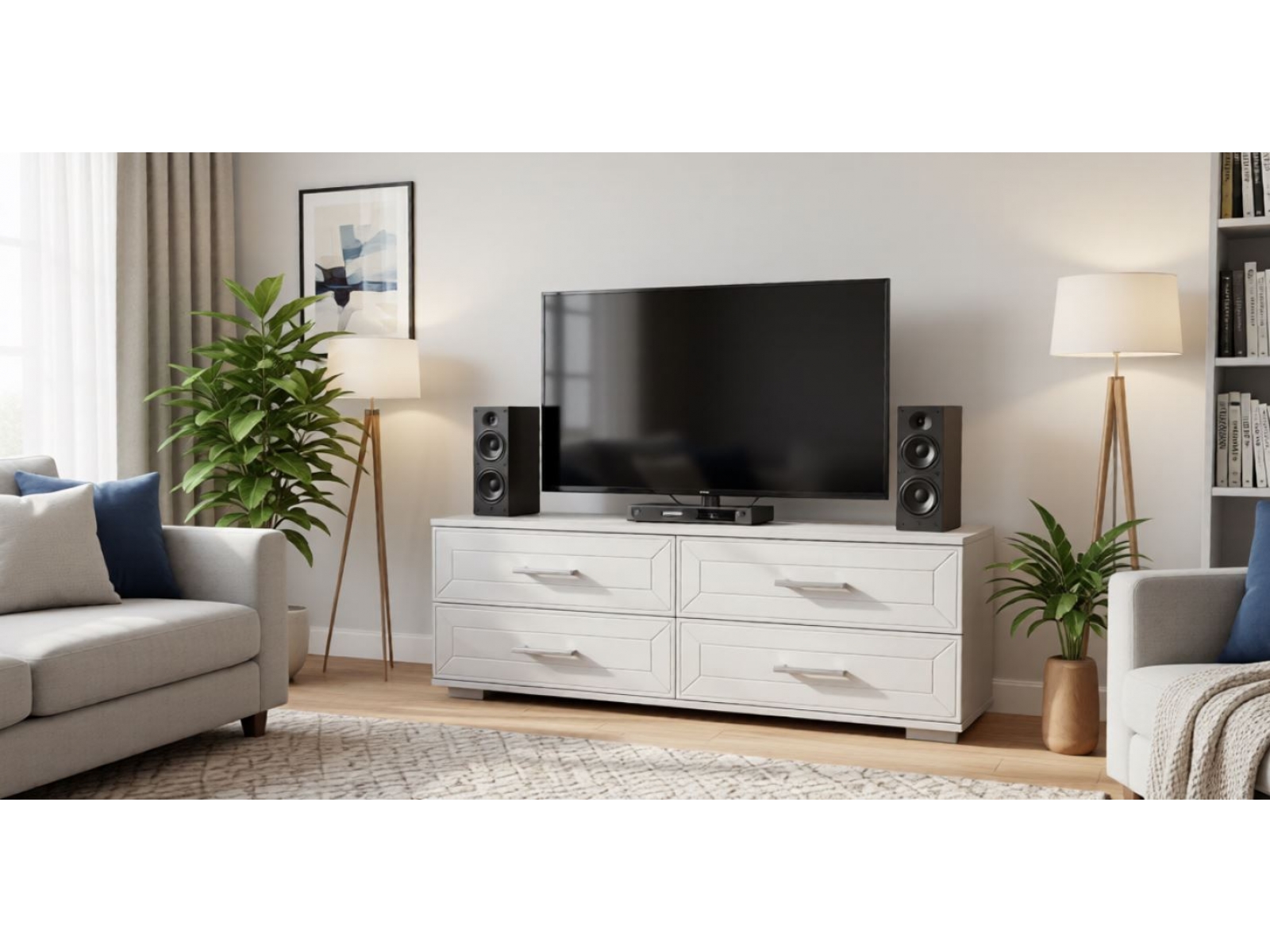 ТВ-тумба серии София подойдет для размещения монитора с большой диагональю и других мультимедийных устройств. Четыре ящика помогут поддерживать порядок в комнате.Фрезеровка служит стильным декором, а белый оттенок вносит в оформление уютный акцент.Эта тумба легко сочетается с другими модулями гостиной София, позволяя создать гармоничный и стильный интерьер. Выбрав тумбу София, вы получите не только практичное решение для хранения, но и элемент декора, который добавит уют и элегантность в вашу гостиную.
