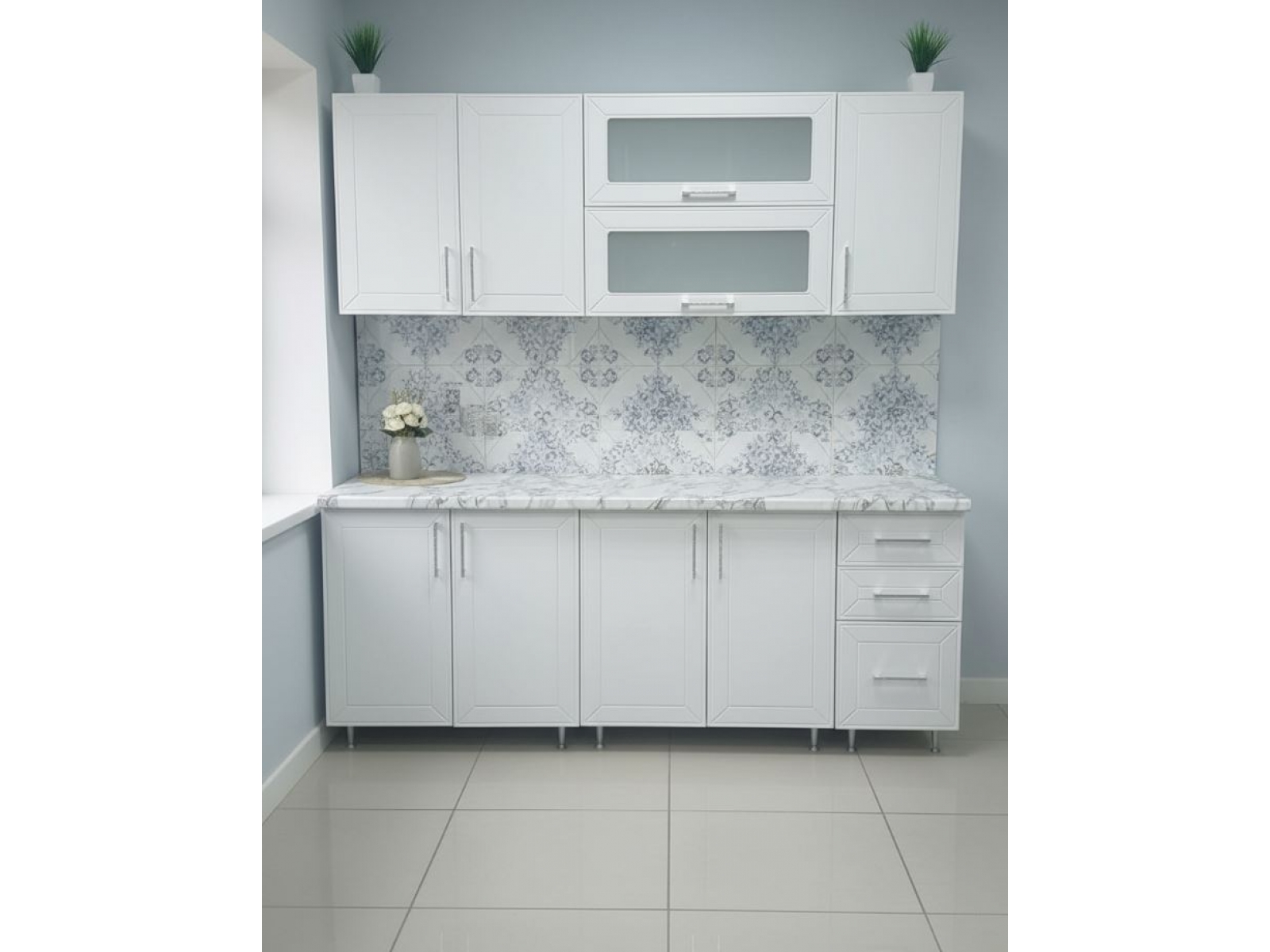 Кухонный гарнитур "София" станет идеальным решением для создания функциональной и стильной кухни. Ее дизайн в белом текстурном цвете и сочетание со столешницей Итальянский Мрамор привнесут в интерьер легкость и уют. Гарнитур выполнен из прочного ЛДСП, что гарантирует долговечность и устойчивость к механическим повреждениям.
