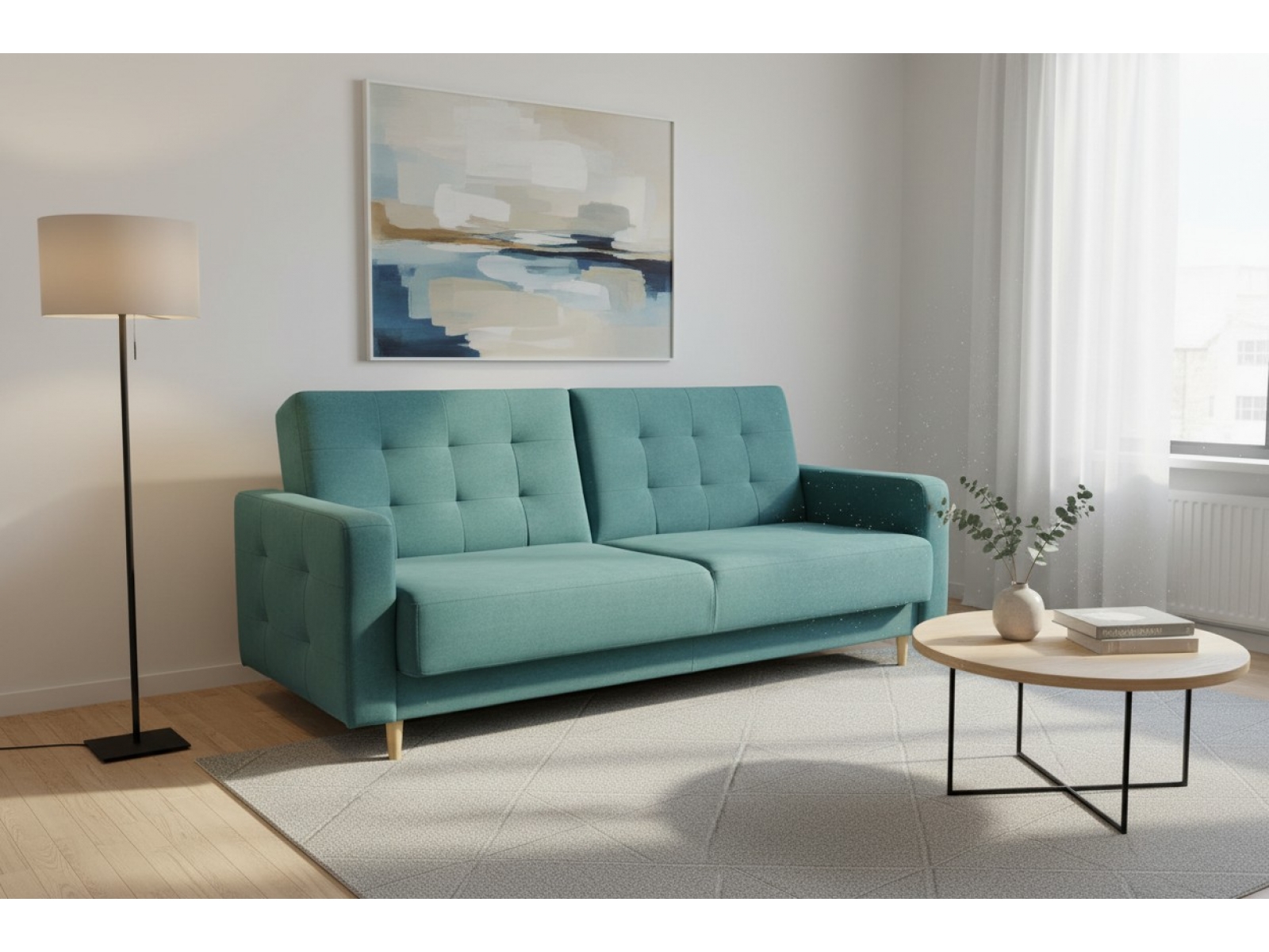 - Практичный дизайн: спокойная однотонная обивка, декоративная квадратная стёжка, приподнятые деревянные ножки облегчают уборку и добавляют визуальной лёгкости.